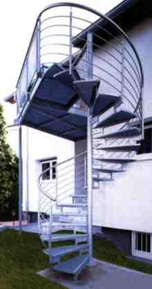 Außen-Stahlspindeltreppe, Geländer mit mitlaufenden Stahlstäben, Stufen Gitterrost, alles feuerverzinkt.