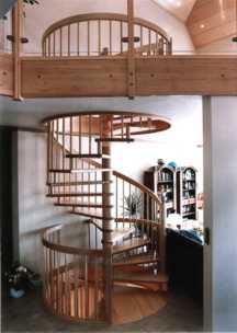 Holzspindeltreppe in Ahorn, mit Standardgeländer, Stäbe rund, Galeriegeländer in ESG mit edelstahlfarbigen Abstandhaltern.